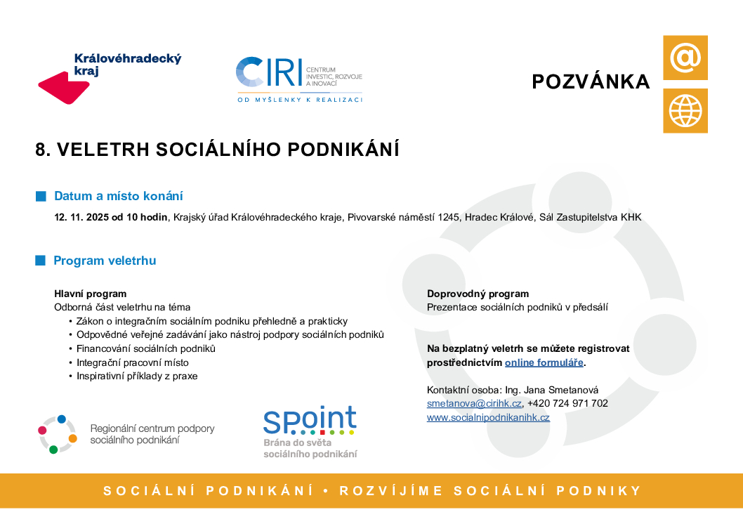 Centrum investic, rozvoje a inovací společně s Královéhradeckým krajem pořádá 12. listopadu 2025 již osmý ročník Veletrhu sociálního podnikání v Hradci Králové.